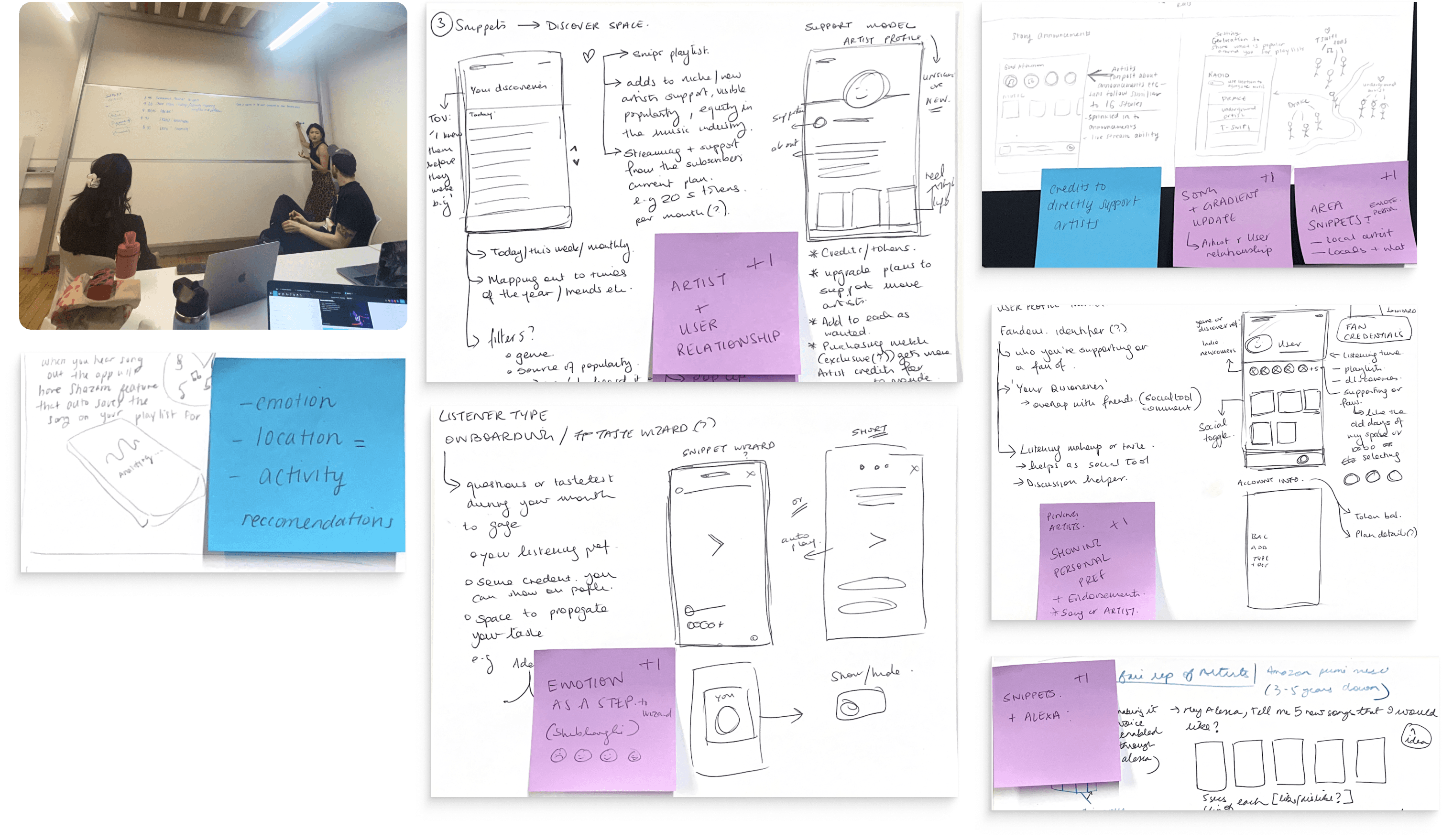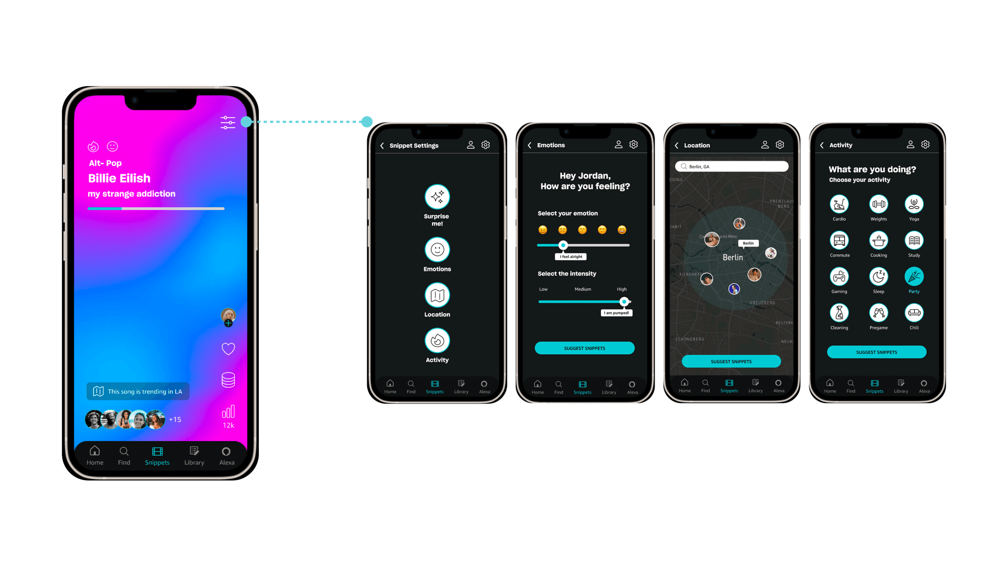 We developed our porotype using Figma and concentrated on two key flows. The first involved exploring new artists by using the Snippets feature and then using one of the filters (Emotion, Location, or Activity) to find something more curated.
