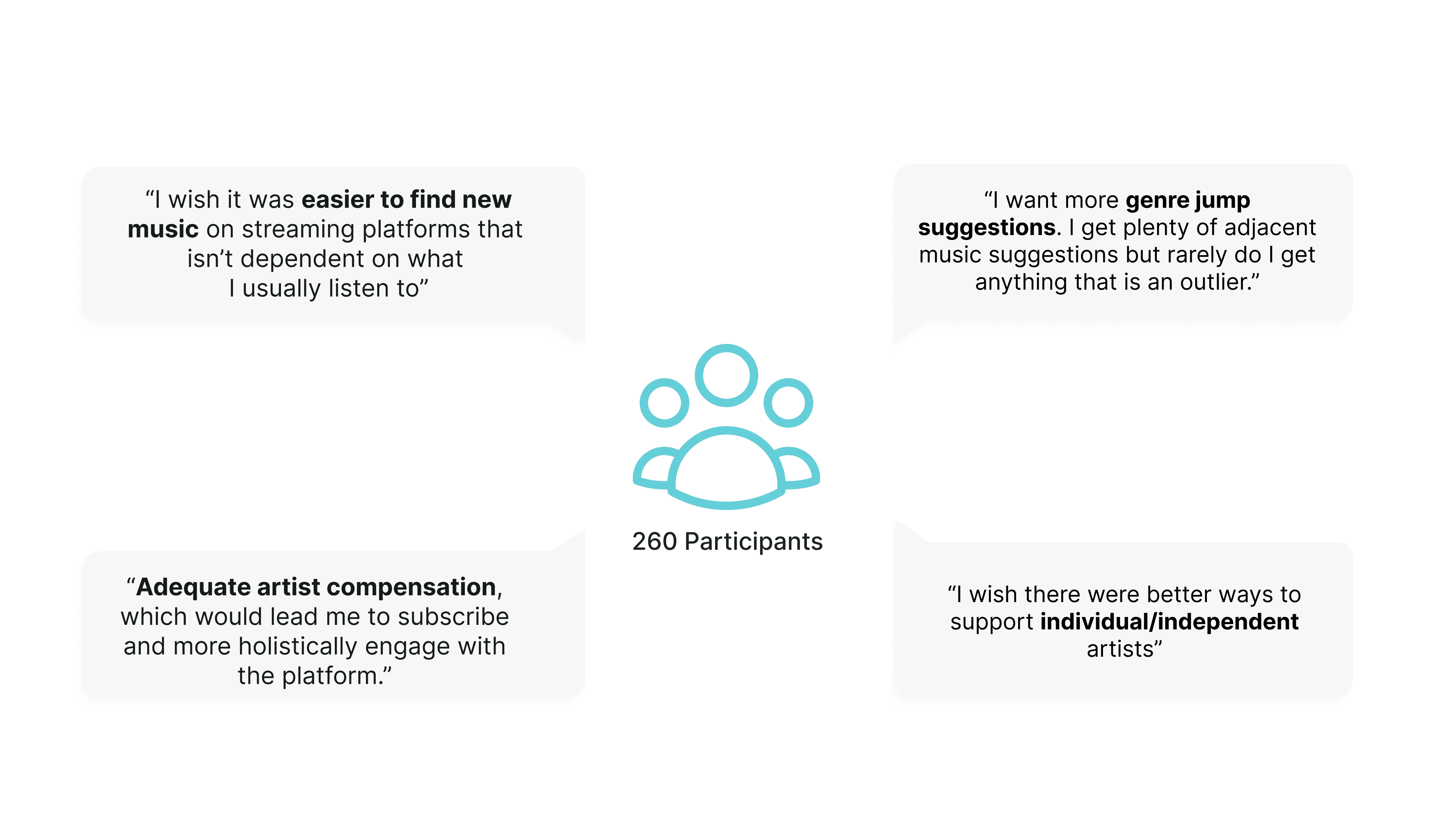 We sent out a Google Form as an initial survey to people within our network. Our survey yielded a treasure trove of valuable data, with over 250 responses shedding light on how individuals consume music in the age of streaming. Following this, we narrowed our focus and interviewed volunteer participants to provide additional insights.