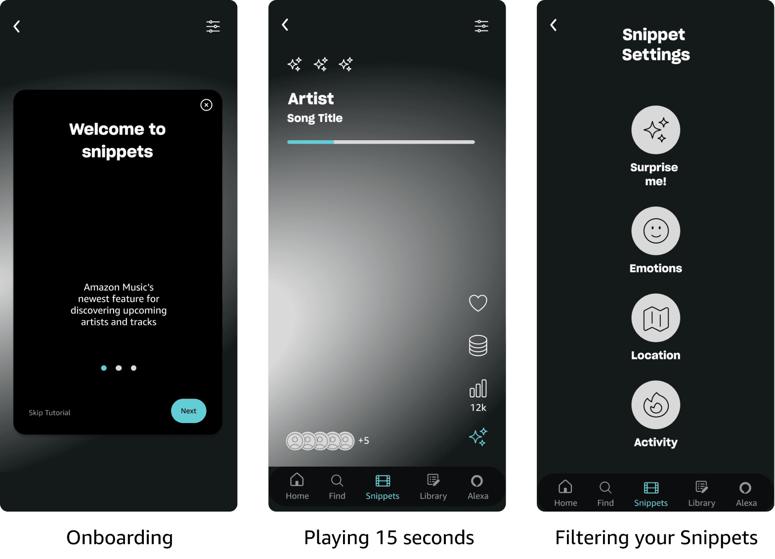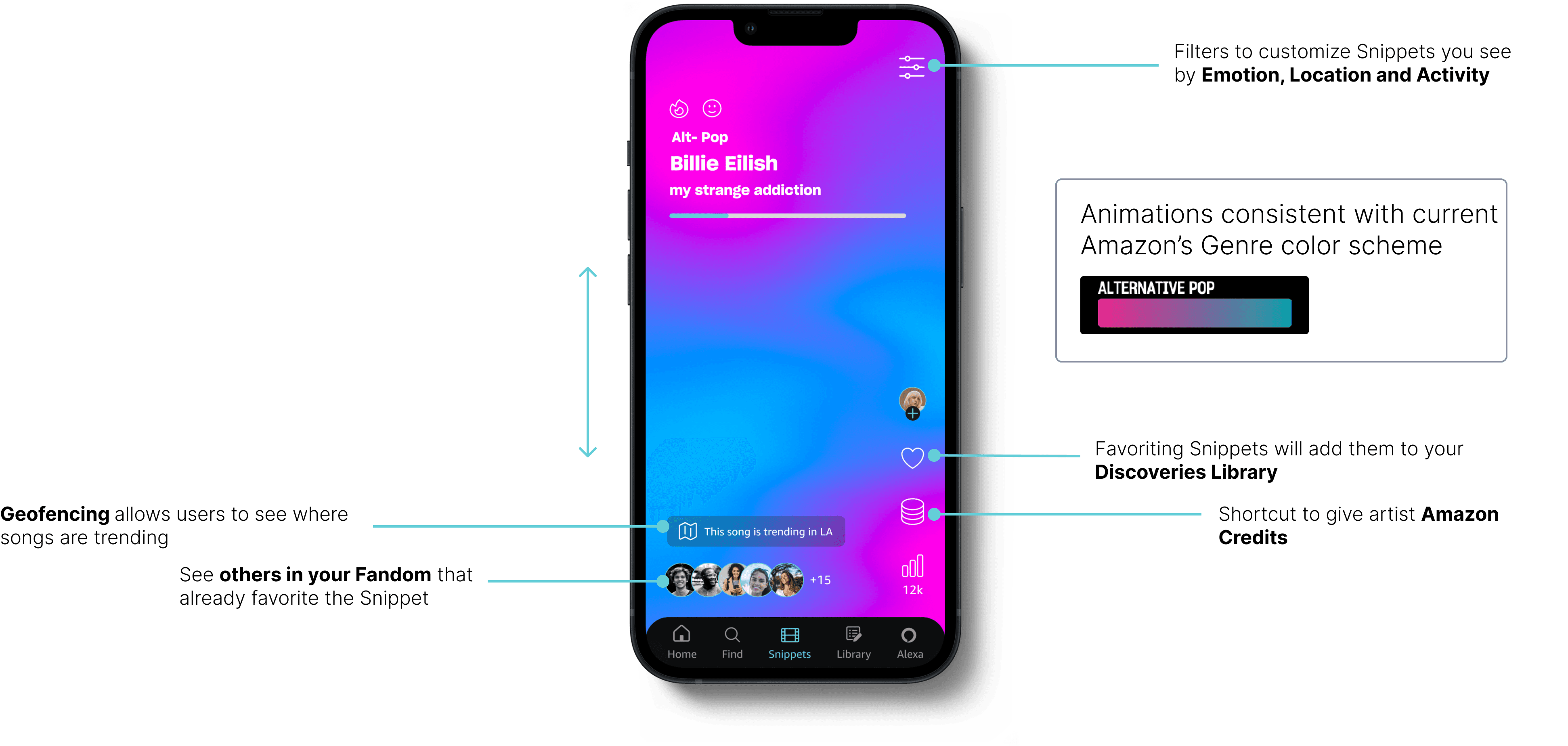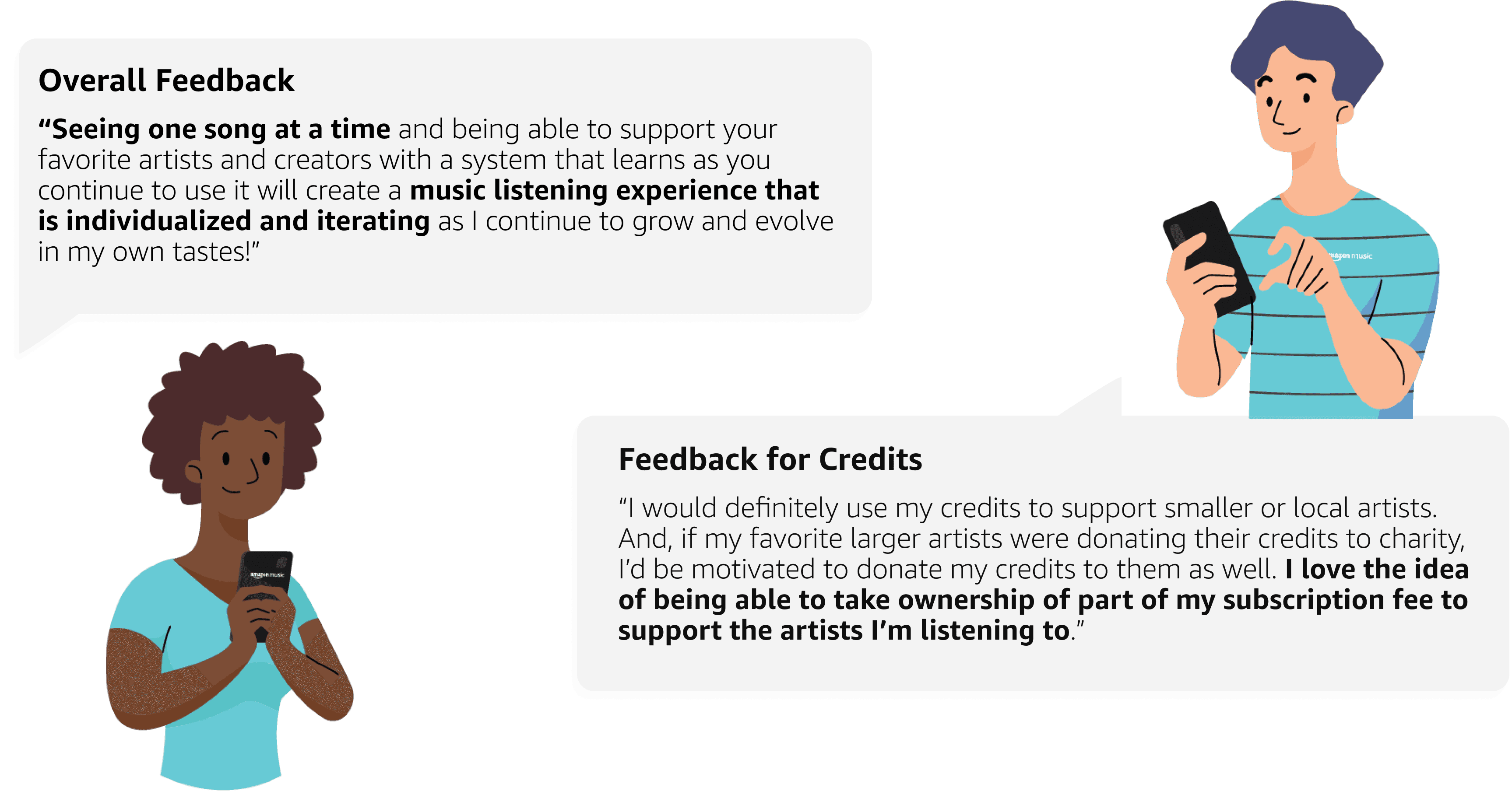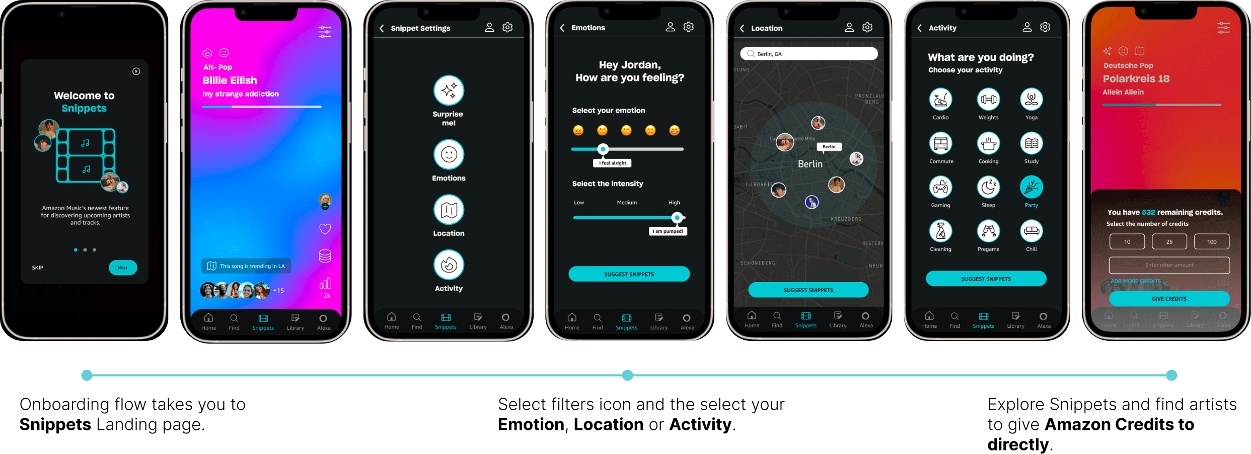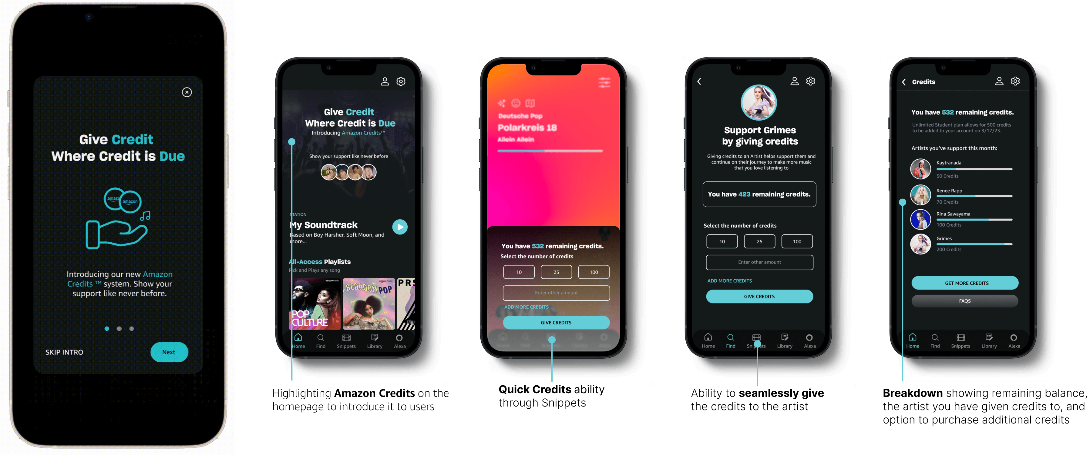 Following a review from a board of faculty at the School of Information, our design concepts of Amazon Snippets and Amazon Credits were selected amongst 21 other teams as a finalist to present to Amazon Music's Product team and company.