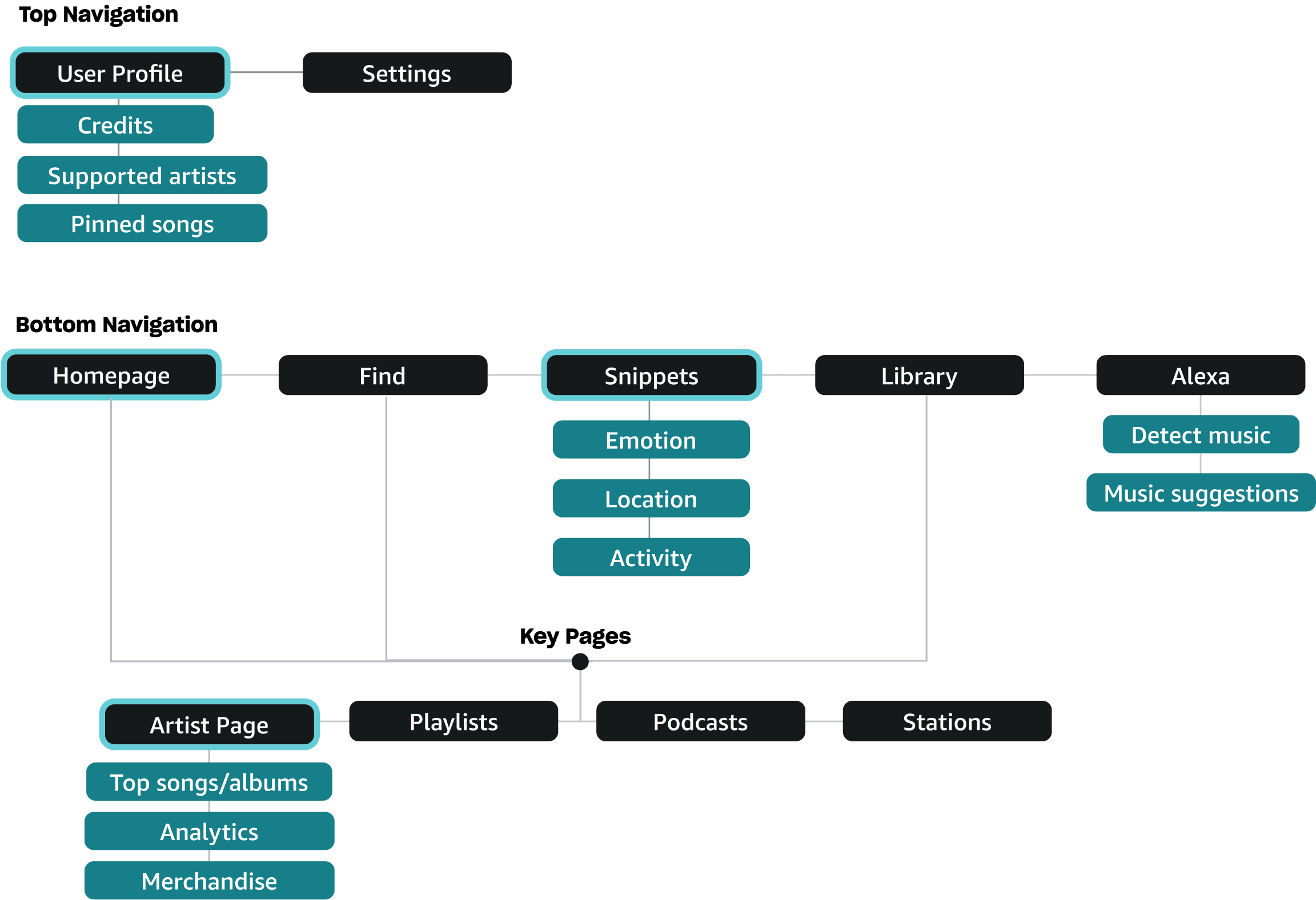 We analyzed and designed the information architecture of the Amazon Music app to fit our dual-sided feature of discovery and support.